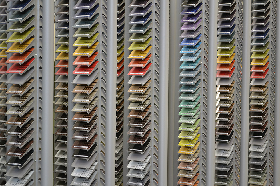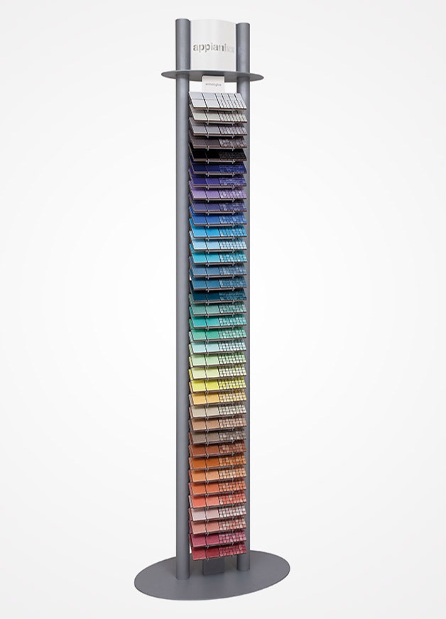 La struttura bifacciale, realizzata interamente in metallo verniciato a polveri, si sviluppa verticalmente occupando pochissimo spazio nell’area di vendita consentendo, allo stesso tempo, l’esposizione di una vastissima gamma di campioni.