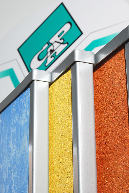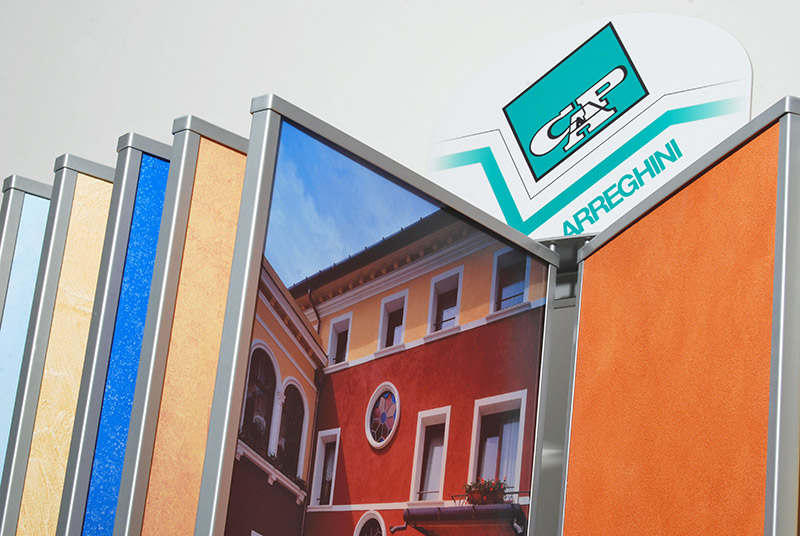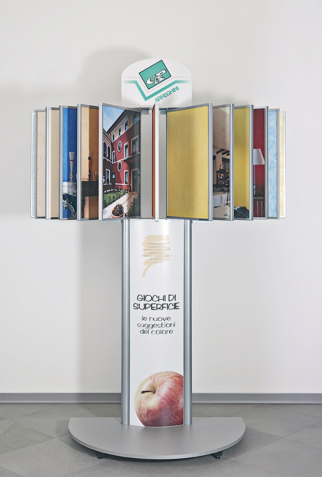 CAP Arreghini Espositore con pannelli a libro, girevoli, in cui sono esposti campioni colore in alternanza ad immagini fotografiche. Struttura in metallo verniciato a polveri e pannelli compositi