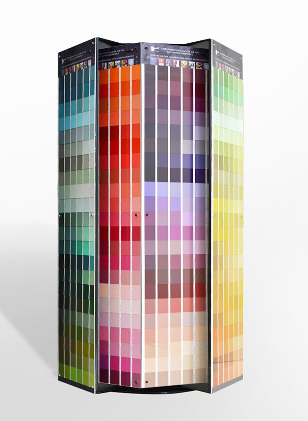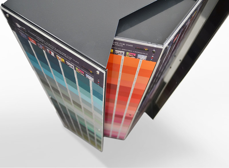 Max Meyer - Girella esagonale Espositore da banco a base esagonale, per esposizione strip colore, costituita da un corpo centrale e pannelli esterni rotanti, protezione in plexiglas trasparente.